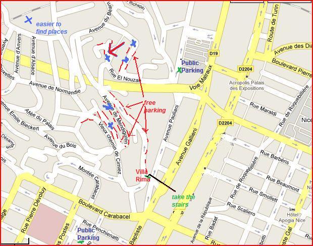 Take the stairs of the avenue des Arènes de Cimiez to join the rue pauliani, go straight untill the bridge, on the other side you see the "P of the entrance - The office is on the other side. Prendre les escaliers sur la gauche vers la rue Pauliani et aller tout droit, passer sous le pont, on voit alors le "P du parking. Le bureau se situe de l'autre côté