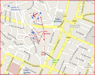 on this map, you can find good possibilities to find parking places in the street (for free) in the neighbourg
